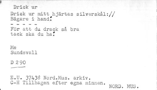 //// Drick ur //// Drick ur mitt hjärtas silverskål:// , //// Bägare i handf //// < //// For att du drack så bra //// tack ska du hat //// t //// Me //// Sundsvall //// D 290 //// i //// t //// E.U. 3743^ Nord.Mus. arkiv. //// C-H Tillhagen efter egna minnen. ! //// ^ NORD. MUS. ////