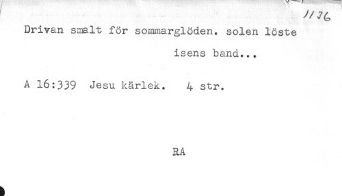 //// Drivan smalt för sommarglöden, solen löste //// isens band... //// A 16:339 Jesu kärlek. 4 str. //// RA ////