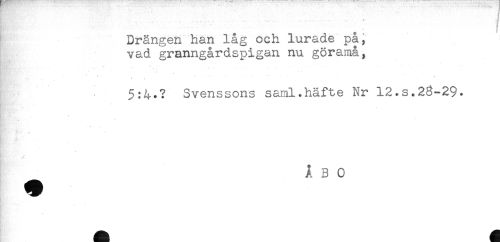 //// Drängen han låg och lurade på, //// vad granngårdspigan nu görarna, //// gr //// . ' //// . . //// Svenssons saml.häfte Nr 12.s.28-29. //// By - //// ^ * * //// i //// * //// . //// - //// ÅBO ////