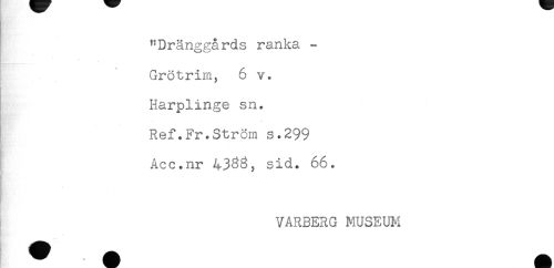 //// "Dränggårds ranka - //// Grötrim, 6 v. //// Harplinge sn. //// Ref.Fr.Ström s.299 //// Acc.nr 43^8, sid. 66. //// VARBERG MUSEUM ////