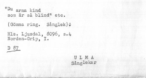 //// "Du arma kind //// som är så blind" etc. //// (Gömma ring. Sånglek)ö //// Hls. Ljusdal, 3096, s.4 //// Norden-Grip, 1. //// U L M A //// Sånglekar ////