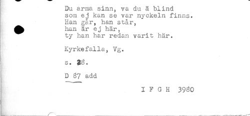 //// Du arma smn, va du ä blind //// som ej kan se var nyckeln finns. //// Han går, han står, //// ^^ han är ej här, //// ty han har redan varit här. //// < //// Kyrkefalla, Vg. //// i //// s. //// D $7 add //// I F G H 39^0 //// tRA-f';'.-. ////