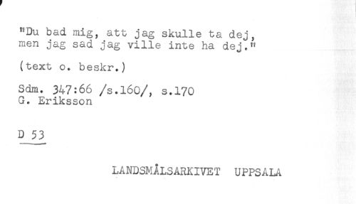 //// "Du bad mig, att jag skulle ta dej, //// men jag sad jag ville inte ha dej." //// (text o. beskr.) //// Sdm. 347:66 /s.l6o/, s.170 //// G. Eriksson //// D 53 //// LANDSMALSARKIVET UPPSALA //// ** ////