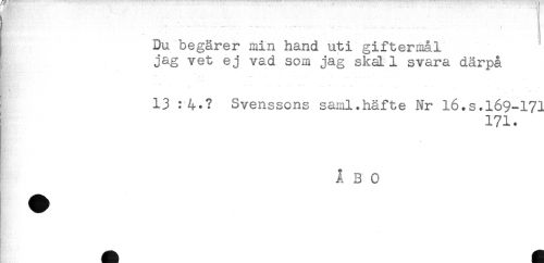 //// Hf . . ^ .". . _ _ ....... .....' ^ ! //// I Du begärer min hand uti giftermål ^ //// jag vet ej vad som jag skäLl svara därpå //// 13 Svenssons saml.häfte Nr l6.s.l69-17; //// 171. //// . //// ÅBO ////