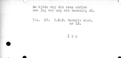 //// ' //// Du bjödo mig din rena kärlek //// men jag var ung och barnslig då. //// - //// - //// 7:4. LT. I.N.E. Gammals visb. //// nr 12. //// ÅBO ////