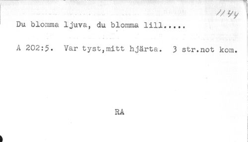 //// ' Du blomma ljuva, du blomma lill..... ! //// < //// ' i //// < //// , " - - * -.....'- ;.- //// ** *** - -. * * - * . ... //// A 202:5. Var tyst,mitt hjärta. 3 str.not kom. //// i //// ! //// f //// : //// t //// ! //// < //// RA ////