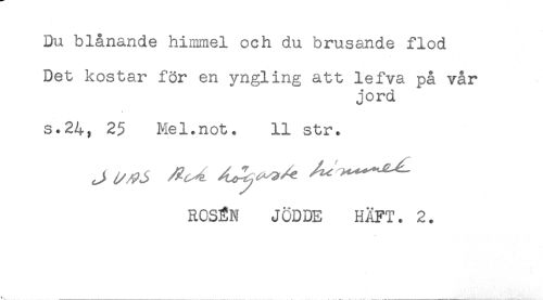 //// Du blånande himmel och du brusande flod //// Det kostar för en yngling att lefva på vår //// jord //// s.24, 25 Mel.not. 11 str. //// ROSÉN JÖDDE HAFT. 2. ////