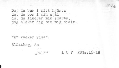 //// ^ t/ 4 //// Du, du bor i mitt hjärta //// du, du bor i min själ //// du, du lindrar min. smärta, //// jag älskar dig som mig själv. //// r i //// /"En vacker visa". //// * * - //// Slätthög, Sm //// J - L U F 2334:16-16 ////