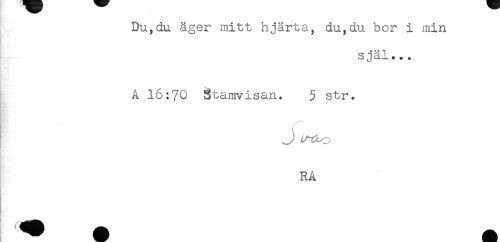 //// Du,du äger mitt hjärta, du,du hor i min //// själ..* //// B' //// A 16:70 Stamvisan. 5 str. //// RÅ ////