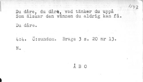 //// * ' ^ ^^^ //// ^ Du dåre, du dår4, vad tänker du uppå //// Som älskar den vännen du aldrig kan få. //// Du dåre. //// 4:4* ö:sundom. Brage 3 s. 20 nr 13. //// N. //// i ////