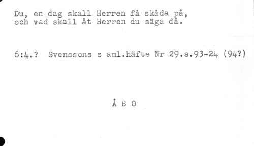 //// Du, en dag skall Herren få skåda på, //// och vad skall åt Herren du säga då. //// < ? //// 6:4.? Svenssons s aml.häfte Nr 29.s.93-24 (94?) //// ÅBO ////