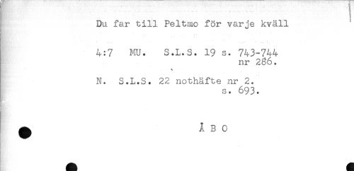 //// ' *. * //// Du far till Peltmc för varje kväll //// § .... //// 4:7 MU. S.L.S. 19 s. 743-744 //// nr 286. //// N. S.L.S. 22 nothäfte nr 2. //// s. 693. //// ^ ÅBO ////
