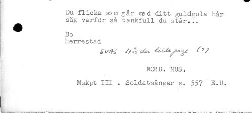 //// Du flicka som går msd ditt guldgula hår //// säg varför så tankfull du står... //// ^ Bo //// i //// Herrestad //// NCRD. ms. //// Mskpt III . Soldatsånger s. 557 E.U. //// ) ////