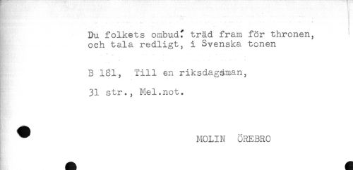 //// t ! //// Ht!* * i! //// ' _ ' . ' ' ' . ..... //// Du folkets ombudf träd fram för thronen, //// och tala redligt, i Svenska tonen //// -- - * //// , ... //// B 181, Till en riksdagéman, //// 31 str., Mel.not. //// ^ MOLIN ÖREBRO //// - //// f . ////