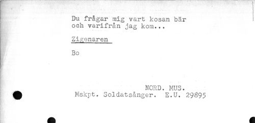 //// f - ....... t //// Du frågar mig vart kosan bår //// och varifrån jag kom... //// Zigenaren //// Bo //// < * //// * * //// .. - . . //// c - - //// NORD. MUS. //// ^ Mskpt. Soldatsånger. E.U. 29395 ////