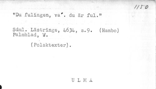 //// "Du fulingen, va*, du år ful." //// - , ! //// ^ - - .. . ! //// 4 t //// i //// Sdml. Lästringe, 4634, s.9. (Hambo) //// Palmblad, W. //// i //// (Polsktexter). //// j //// t //// : ////