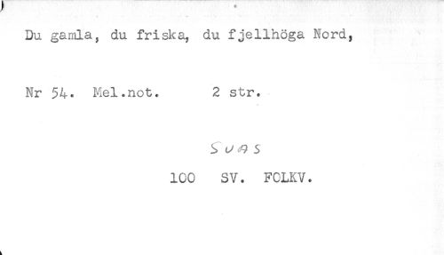 //// - //// Du gamla, du friska, du f jellhöga Nord, //// Nr 54* Mel.not. 2 str. //// ... -y ? .' //// 100 SV. FC-LKV. ////