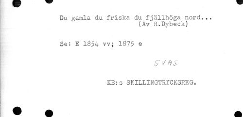 //// Du gamla du friska du fjällhöga nord... //// (Av R.Dybeck) //// Se: E 1S54 w; 1875 e //// KB:s SKILLINGTRYCKSREG. ////