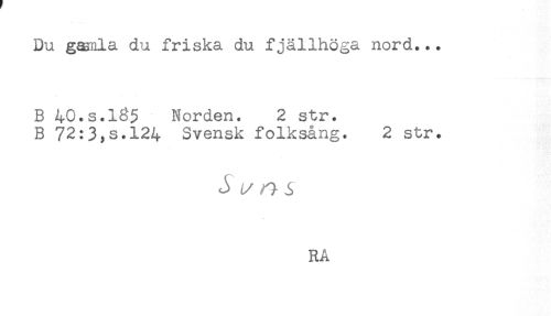 //// Du gamla du friska du fjällhöga nord... //// B 40.s.135 Norden. 2 str. //// B 72:3,s.124 Svensk folksång. 2 str. //// ^ ^ <s //// RA ////