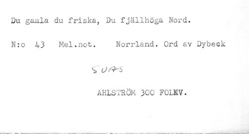 //// Du gamla du friska, Du fjällhöga Nord. //// N:o 43 Mel.not. Norrland. Ord av Dybeck //// AHLSTRÖM 300 FOLKV. ////