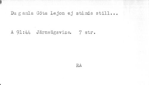 //// Du gamla Göta Lejon ej stånda still... //// A 91:44 Järnvägsvisa. 7 str. //// RA ////