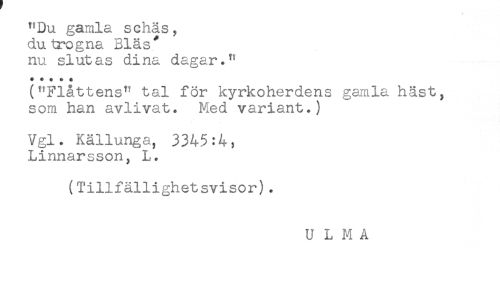 //// "Du gamla schas? //// du trogna Bläs* //// nu slutas dina dagar." //// + + + + * //// ("Flåttens" tal för kyrkoherdens gamla häst, //// som han avlivat. Med variant.) //// Vgl. Källunga, 3345:4, //// Linnarsson, L. //// (Tillfällighetsvisor). ////
