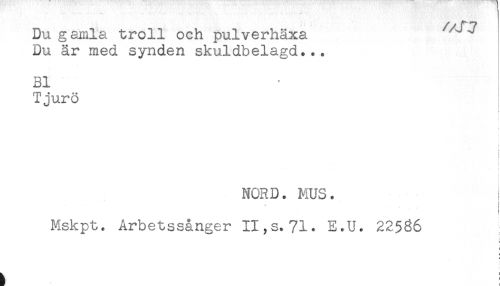//// Du gamla troll och pulverhäxa /Af? //// Du är med synden skuldbelagd... //// Bl //// T jurö //// t //// t //// t //// < //// ? //// * //// r //// r //// t //// ) //// i //// NORD. MUS. //// j //// Mskpt. Årbetssånger II,s.71. E.U. 22586 ////
