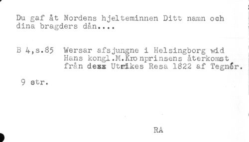 //// ! //// Du gaf åt Nordens hjelteminnen Ditt namn och //// dina bragders dån.... //// r //// B 4,s.85 Wersar afsjungne i Helsingborg wid ; //// Hans kongl.M.Kronprinsens återkomst //// från dess Utrikes Resa 1822 af Tegnér. //// 9 str. ////