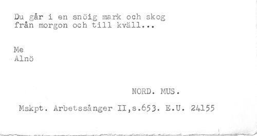 //// Du går i en snöig mark och skog //// från morgon och till kväll... //// Me //// Alnö //// NORD. MUS. //// Mskpt. Arbetssånger II,s.653. E.U. 24155 ////