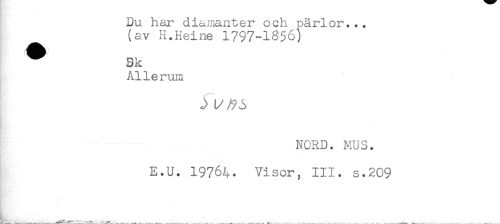 //// Du har diamanter och närlor... //// (av H.Heine 1797-1356) //// Sk //// Allerum //// NORD. MUS. //// E.U. 19764. Visor, III. s.209 //// - ////