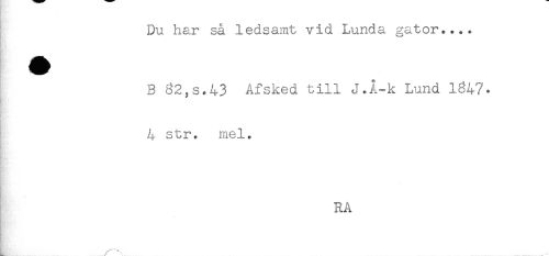//// Du har så ledsamt vid Lunda gator.... //// B 82,s.43 Afsked till J.Å-k Lund 1647. //// 4 str. mel. //// - //// By * //// RA //// r^.. .... ////