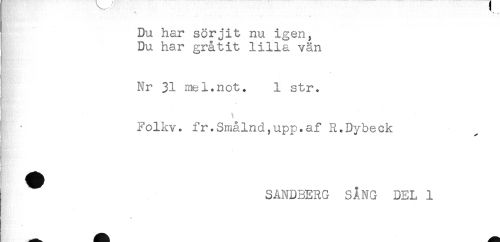 //// Du har sörjit nu igen, //// Du har gråtit lilla vän //// . //// Nr 31 mel.not. 1 str. //// Folkv. fr.Smålnd,upp.af R.Dybeck //// ^ SANDBERG SÅNG DEL 1 ////