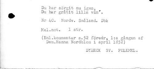 //// Du har sörgit nu igen, //// ^ Du har gråtit lilla vän'. //// Nr 40. Nordv. Småland. Dbk //// . //// Mel.not. 1 str. //// * //// //// /(Enl.kommentar s.$2 föredr, l:a gången af //// Dem.Hanna Nordblom 1 april l6$2) //// DYBECK SV. FOLKMEL. //// * ----W - -- . -.r. ^ ---, t---- "-V-r----.--- ---..- ,----- ---- ////