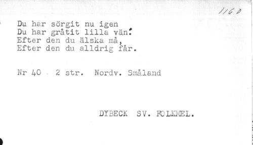 //// Du har sörgit nu igen //// Du har gråtit lilla vänt //// Efter den du älska må. //// Efter den du alldrig får. //// i //// i //// Nr 40 2 str. Nordv. Småland //// i //// t //// < //// i //// t- //// DY3ECK SV. FCLEMEL. ////