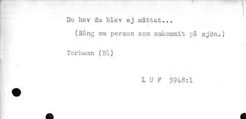 //// Du hav du blev ej mättat... //// '- - //// (Sång om person som omkommit på sjön.) //// Torhamn (Bl) //// . //// L U F 5948:1 ////