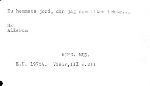 //// Du hemmets jord, där jag som liten lekte... //// Sk //// Allerum //// NCRD. MUS. //// E.U. 19764. Visor,III s.211 ////