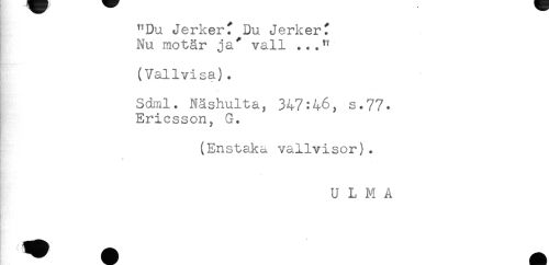 //// ^Du Jerkerf Du Jerkerf //// Nu motär ja^ vall . . . //// (Vallvisa). //// Sdrnl. Näshulta, 347:46, s.77* //// Ericsson^ G. //// (Enstaka vallvisor). //// - //// U L M A ////