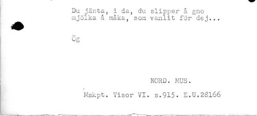 //// Du jänta, i da, du slipper å gno //// mjölka å maka, som vanlit för dej... //// Cg //// NORD. MUS. //// - //// Mskpt. Visor VI. s.915. E.U.28166 ////