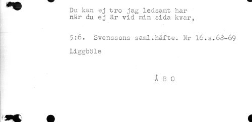 //// ^^ Du kan ej tro jag ledsamt har //// när du ej är vid min sida kvar, //// * //// * //// . //// - - //// 5:6. Svenssons saml.häfte. Nr l6.s.68-69 //// Liggböle //// ÅBO ////