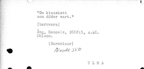 //// j "Du kissekatt //// ! som döder vart." //// ! (bamvers) //// ] Äng, Ramsele, 2663:5, s.40. //// } Ohlson. //// i (Barnvisor) //// v //// I U L M A ////