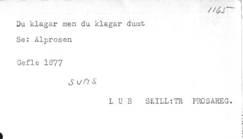 //// Du klagar men du klagar dumt //// Se: Alprosen //// Gefle 1877 //// i //// i //// < //// j //// { //// ) //// L U B SKILL:TR PROSAREG. //// F ////