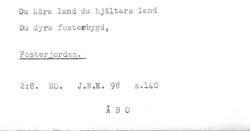 //// Du kära land du hjältars land //// Du dyra fosterbygd, //// Fosterjorden. //// 2:6. HO. J.N.E. 9$ s.140 ////
