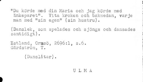 //// "Du körde med din Maria och jag körde med //// änkeparet". Vita kroken och bakmedan, varje //// man med "sin egen" (sin hustru). //// : //// (Danslek, som spelades och sjöngs och dansades //// samtidigt). i //// Estland, Ormso, 2696:1, s.6. //// Gärdström, T. j //// (Danslåtar). //// U L M A ////