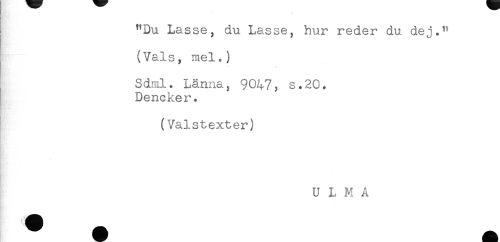 //// ' t. //// "Du Lasse, du Lasse, hur reder du dej." //// (Vals, mel.) //// ** * //// Sdml. Larma, 9047? s.20. //// Dencker. //// (Valstexter) //// U L M A ////