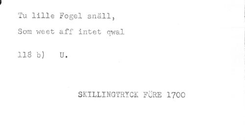 //// Tu lille Fogel snäll, //// Som weet aff intet awal //// j. //// lig b) U. //// ! //// i //// SKILLINGTRYCK FuRE 17CC ////