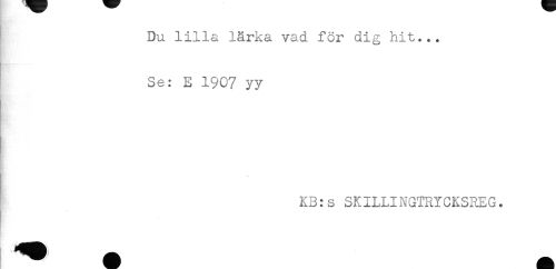//// Du lilla lärka vad för dig hit... //// - //// Se: E 1907 yy //// KB:s SKILLINGTRYCKSREG. //// - ////