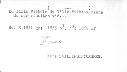 //// ( - ) //// Du lille Vilhelm du lille Vilhelm minns //// du när vitaltes vid... //// Se: E 1351 gg; 1855 b^, j3. 1362 ff //// J/ .- ^ //// KB:s SF^ILLINGTRYCKSRECE. ////