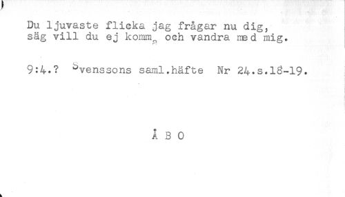 //// Du ljuvaste flicka jag frågar nu dig, //// säg vill du ej komm^ och vandra med mig. //// 9:4.? ^venssons saml.häfte Nr 24.s.lg-19. //// j //// i //// - - ' .' i //// j //// i //// i //// ÅBO ////