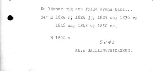 //// Du lämnar mig att följa ärans bana... //// t * * . - . - + //// Se: E 1824 r; 1824 jj; 1825 oo; 1836 r; //// I846 aa; 1848 u; 1850 ee, //// N 1820 a //// KB:s SKILLINGTRYCKSREG. ////