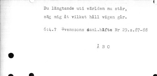 //// Du längtande uti världen nu står, //// säg mig åt vilket håll vägen går. //// 6:4.? Svenssons daml.håfte Nr 29.s.g7-^3 //// A 3 .0 ////